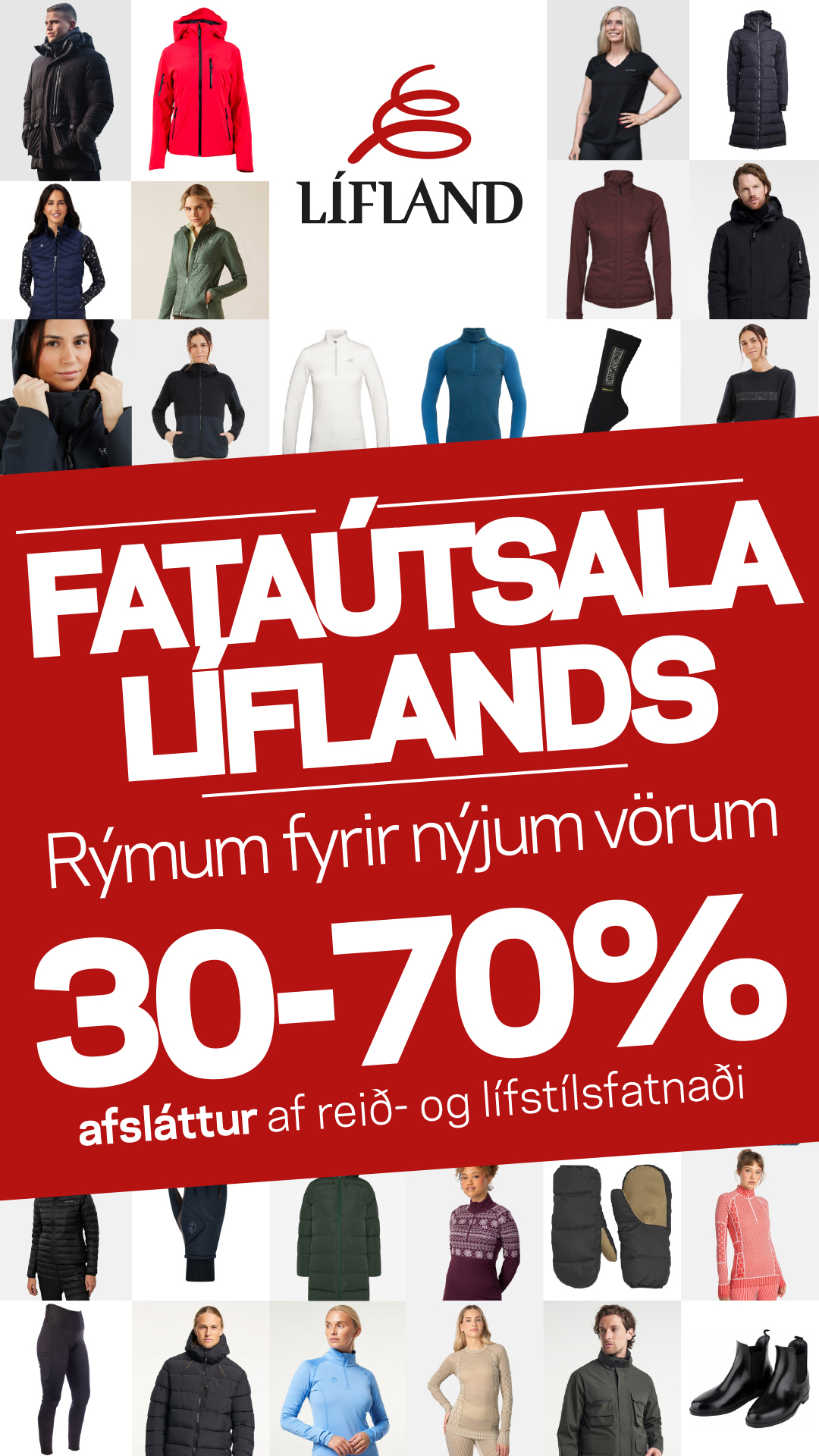 Fataútsala Líflands er nú hafin í öllum verslunum Líflands og vefverslun. Við rýmum fyrir nýjum vörum og bjóðum nú 30-70% afslátt af reiðfatnaði og lífstílsfatnaði.
