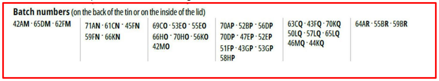 Innkallaðar vörur eru með eftirfarandi lotunúmerum: