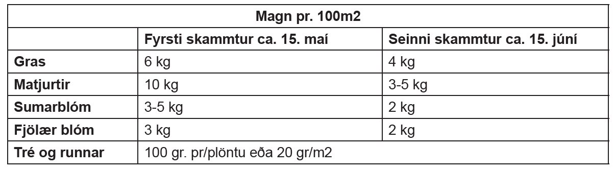 Berið á 2-4 sinnum yfir vaxtartímann frá maí fram í miðjan júlí.