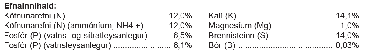 Góður alhliða áburður fyrir allar matjurtir þ.m.t. kartöflur, grasflatir og á trjá- og runnagróður. Inniheldur öll helstu næringar- og snefilefni. Leysist vel upp í jarðvegi.