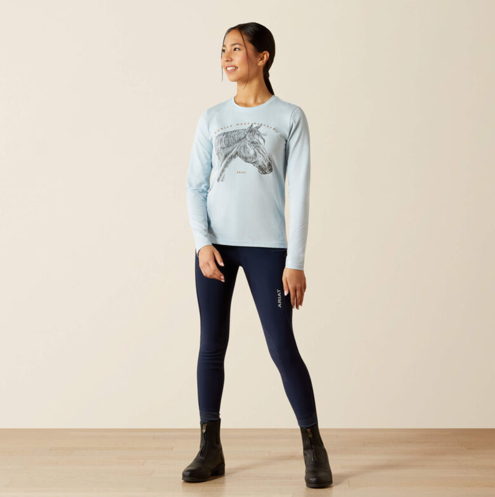 Ariat Liberty bolurinn er úr lífrænni bómullarblöndu, sem er bæði mjúk og umhverfisvæn, er þessi bolur hannaður til að gefa litlum knöpum þægindi og frelsi til að sýna ást sína á hestum – á hverjum degi.