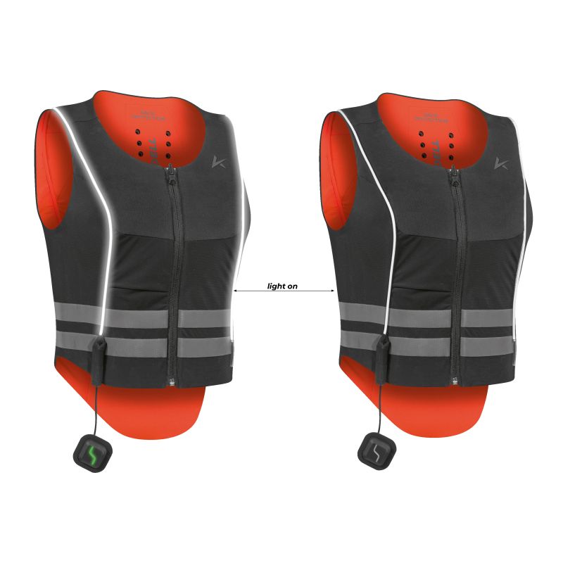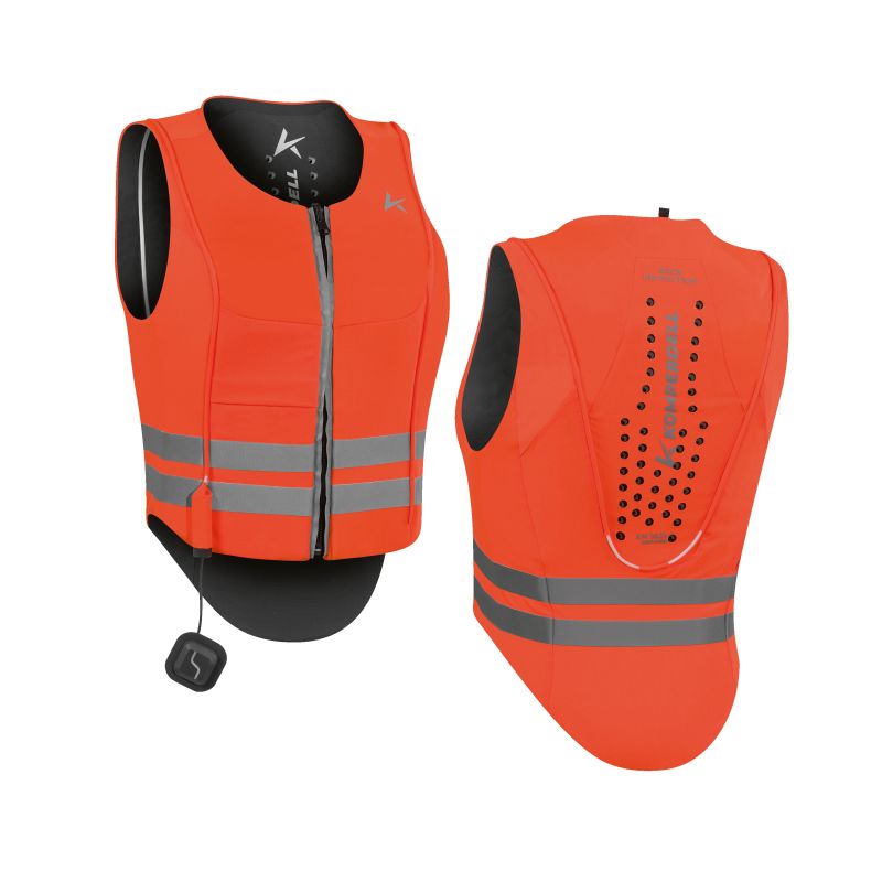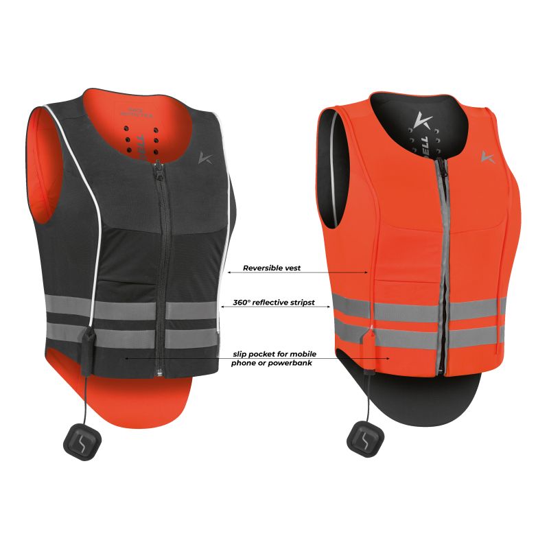 Vandað og nett öryggisvesti með Cross Flex multilayer kerfi sem aðlagar sig að knapanum, ver hann og heftir ekki hreyfingar. Þægilegt og létt. Framleitt samkvæmt EN-öryggisstaðli 1621-2. Vestið er einnig hægt að snúa við og klæðast því svörtu eða skær appelsínugulu fyrir aukinn sýnileika.