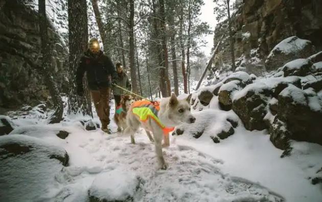 Sterkt efnið veitir þónokkra vörn fyrir veðri og hefur op á baki til að festa taum við ef þú vilt nota beisli undir. Smellur á hliðum auðvelda þér að setja vestið á og taka það af hundinum.