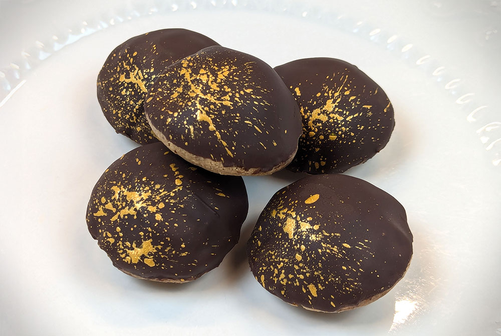 Bræðið eða temprið suðusúkkulaði og dýfið helmingnum af kökusamlokunni ofan í og leggið á smjörpappír.